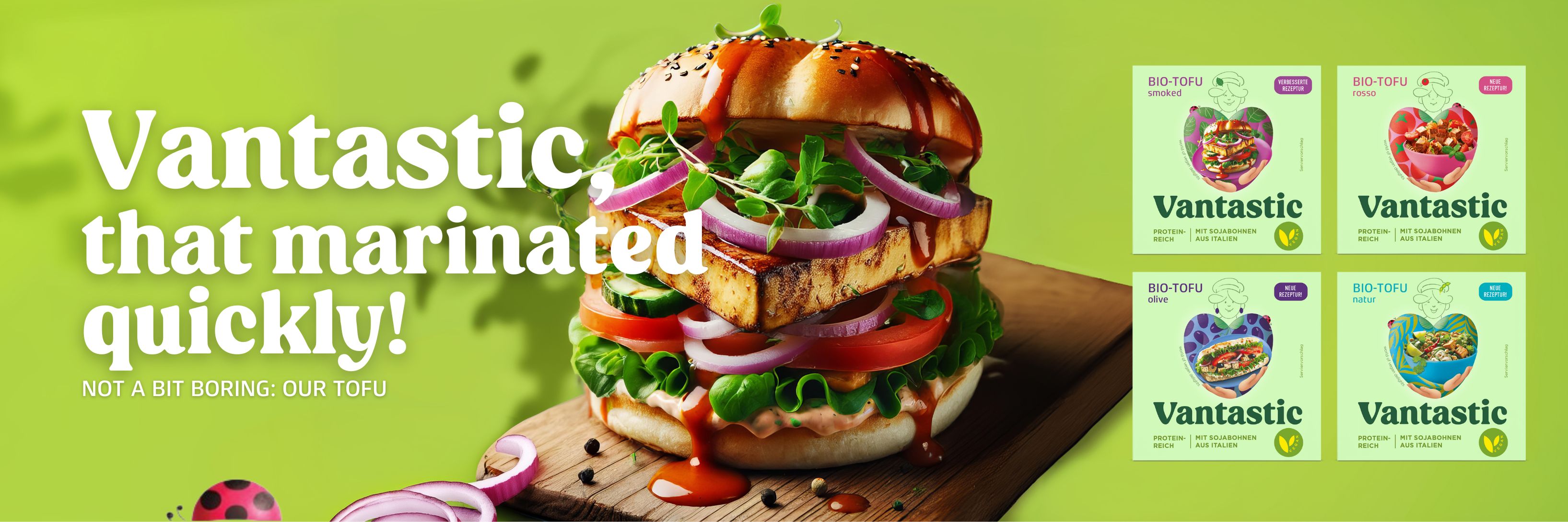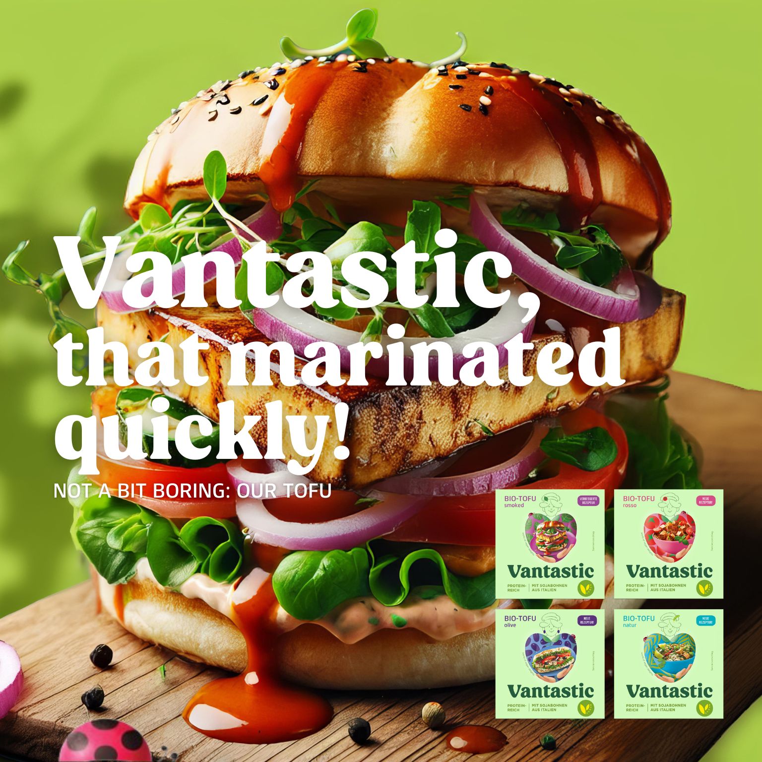 Based on soybeans and harvested from controlled organic cultivation, our Natural Tofu is just around the corner. Its neutral taste opens up a wide range of marinating and seasoning options and its pleasantly firm consistency has won it a lot of fans. Whether it’s spicy, Mediterranean or home cooking-style, tofu’s absorption capacity guarantees versatility in the kitchen. The smoking gun among vegan all-purpose weapons, our Tofu Smoked, smoked in clouds of beech wood and refined with spicy soy sauce, fires its flavourful ammunition bite-by-bite. Perfect as a sandwich filling, salad garnish or as a bacon substitute in mashed potatoes with a pinch of campfire romance. The Vantastic Tofu Rosso lives up to its promise... marinated in a delicious tomato sauce with Mediterranean spices such as oregano, basil and thyme, it looks great in a vegan Bolognese and on a starter plate - buonissimo! Fans of Mediterranean cuisine, prepare to embark on a culinary tour of the Mediterranean right from the first bite with Vantastic’s Olive Tofu. The finest olives from controlled organic cultivation give antipasti, pasta and salads that certain something that even la mamma and la nonna can't say no to.